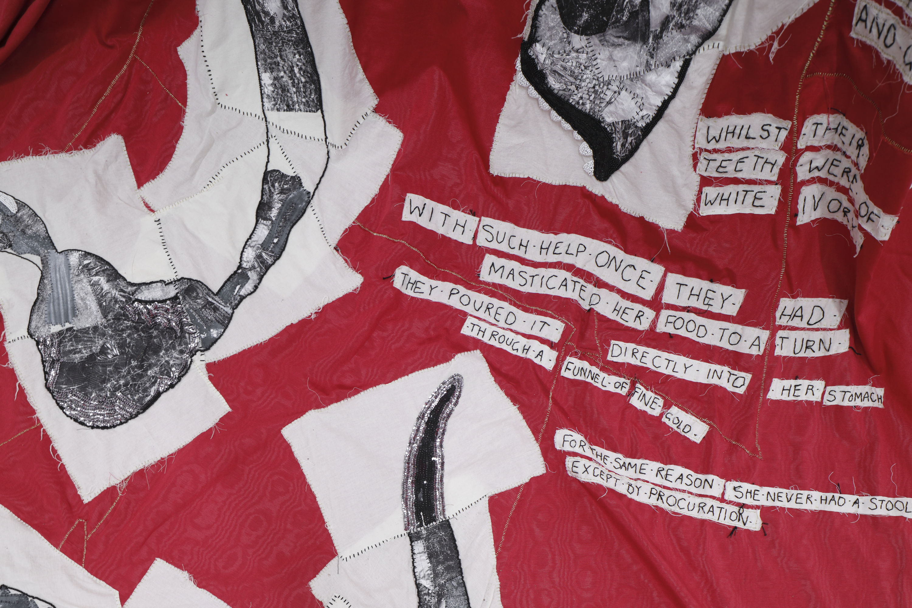 In my ongoing exploration of ideas of luxury and class association, unlike most luxury materials or embellishments, embroidery is literally a show of luxury through the labour of other people. In my own work, I tend to be more interested in embroidery not as a commodity, but as a catharsis, particularly the practices of sick and crip people. Another incredible archive I was blessed to visit (in a research group I co-organised with Jupiter Woods and Daniella Valz Gen) was to see the Lorina Bulwer embroidered letters in Norwich Castle Museum. Bulwer’s mother was her primary carer, and once her mother died, Lorina was put in the ‘lunatic’ section of Great Yarmouth Workhouse, until her death. While there, she made these very, very long letters on scraps of fabric sewn together, which read as stream-of-consciousness texts. The level of hapticity and proximity, and blunt humour, felt so much more present than the rigid samplers which were being produced by most embroiderers at the time. So I think I like to spend so long because I feel like I charge the work with a sort of presence that does not feel there when I use a machine. Because I am always trying to unlearn the most minor criticism I have received, I have to tell myself that while I want my work to be layered with detail, precision and perfection is not what I am striving for.