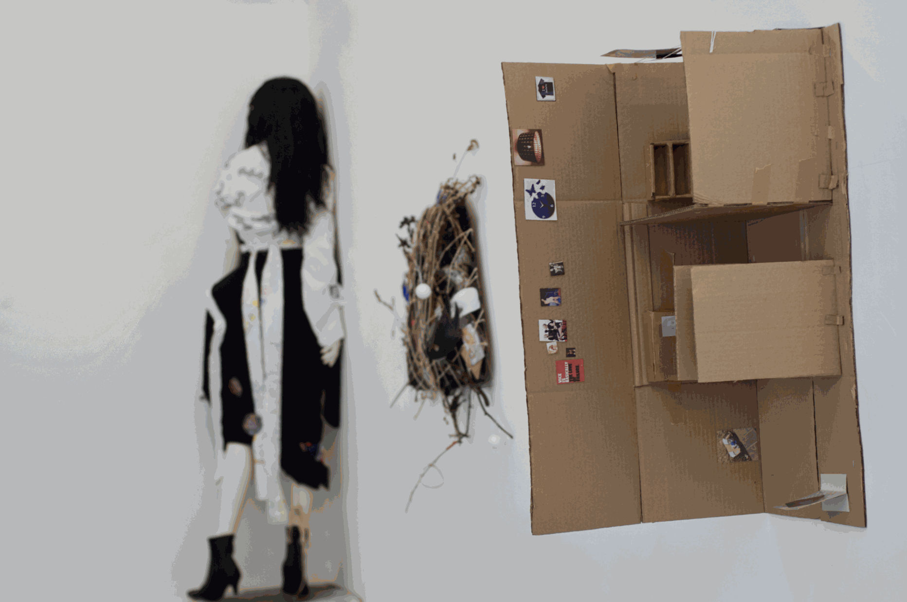 (from left to right) Alice maid (fashion deign on mannequin), maid’s hat, (collage sculpture), and I’ve always depended on the kindness of strangers, (collage sculpture). 2020, Hameau de la Reine, SET Lewisham -