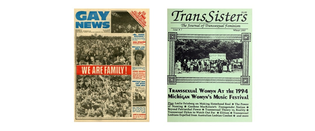 LGBTQ+ newspapers and journals have long alluded to our community’s family structures. Gay News, 1979. Source: Bishopsgate Institute. TransSisters, 1995. Source: Digital Transgender Archive. -